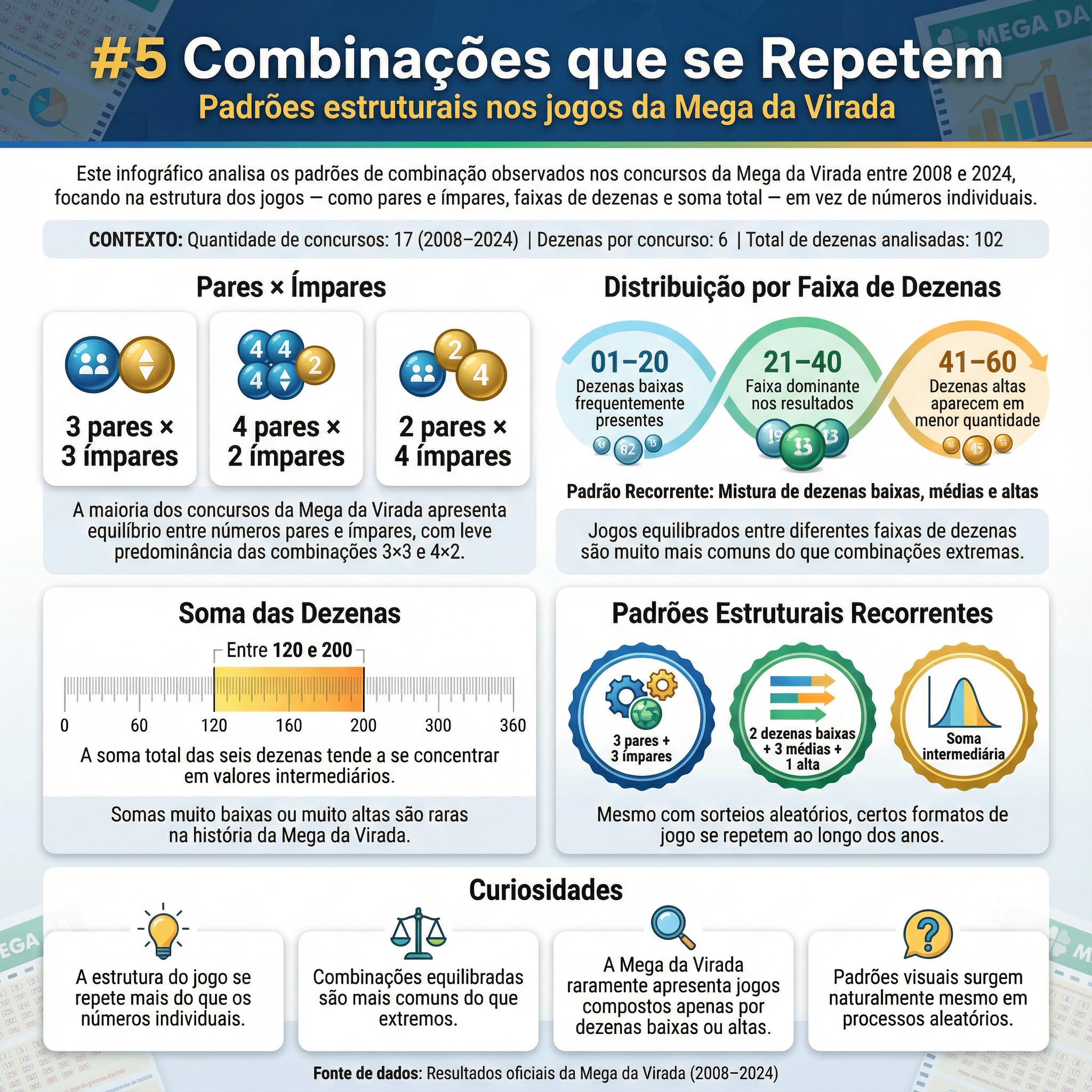 Análise dos padrões estruturais dos jogos, como pares e ímpares, faixas de dezenas e soma total, mostrando que a estrutura do jogo se repete mais do que os números.