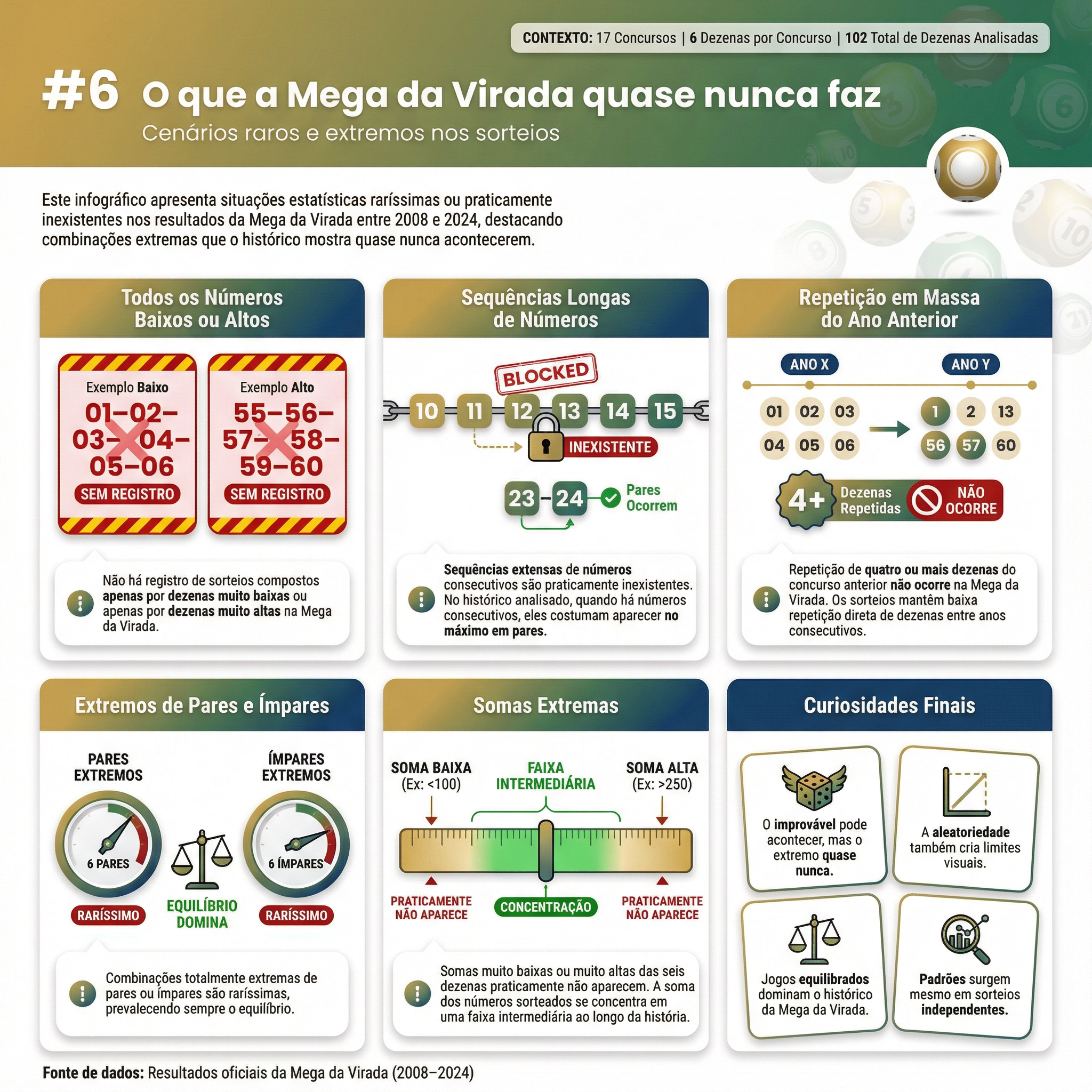 Estatísticas da Mega da Virada 2025 #6 – O que a Mega da Virada quase nunca faz 14 de dezembro de 2025 · de AndreSoft · 0 Exposição dos cenários extremos que raramente ocorrem nos sorteios, como sequências longas, jogos totalmente pares ou ímpares e somas extremas. Visualizar Leia também: Estatísticas da Mega da Virada 2025 #1 – As dezenas que mais saíram Estatísticas da Mega da Virada 2025 #5 – Combinações que se repetem Estatísticas da Mega da Virada 2025 #4 – O que nunca saiu × o que sempre aparece Estatísticas da Mega da Virada 2025 #3 – As dezenas que menos saíram Estatísticas da Mega da Virada 2025 #2 – Padrões e curiosidades Compartilhar este post Twitter Facebook Google+ LinkedIn Pinterest Email Recomendado para você Estatísticas da Mega da Virada 2025 #7 – Mitos e verdades Estatísticas da Mega da Virada 2025 #5 – Combinações que se repetem Estatísticas da Mega da Virada 2025 #4 – O que nunca saiu × o que sempre aparece Estatísticas da Mega da Virada 2025 #3 – As dezenas que menos saíram